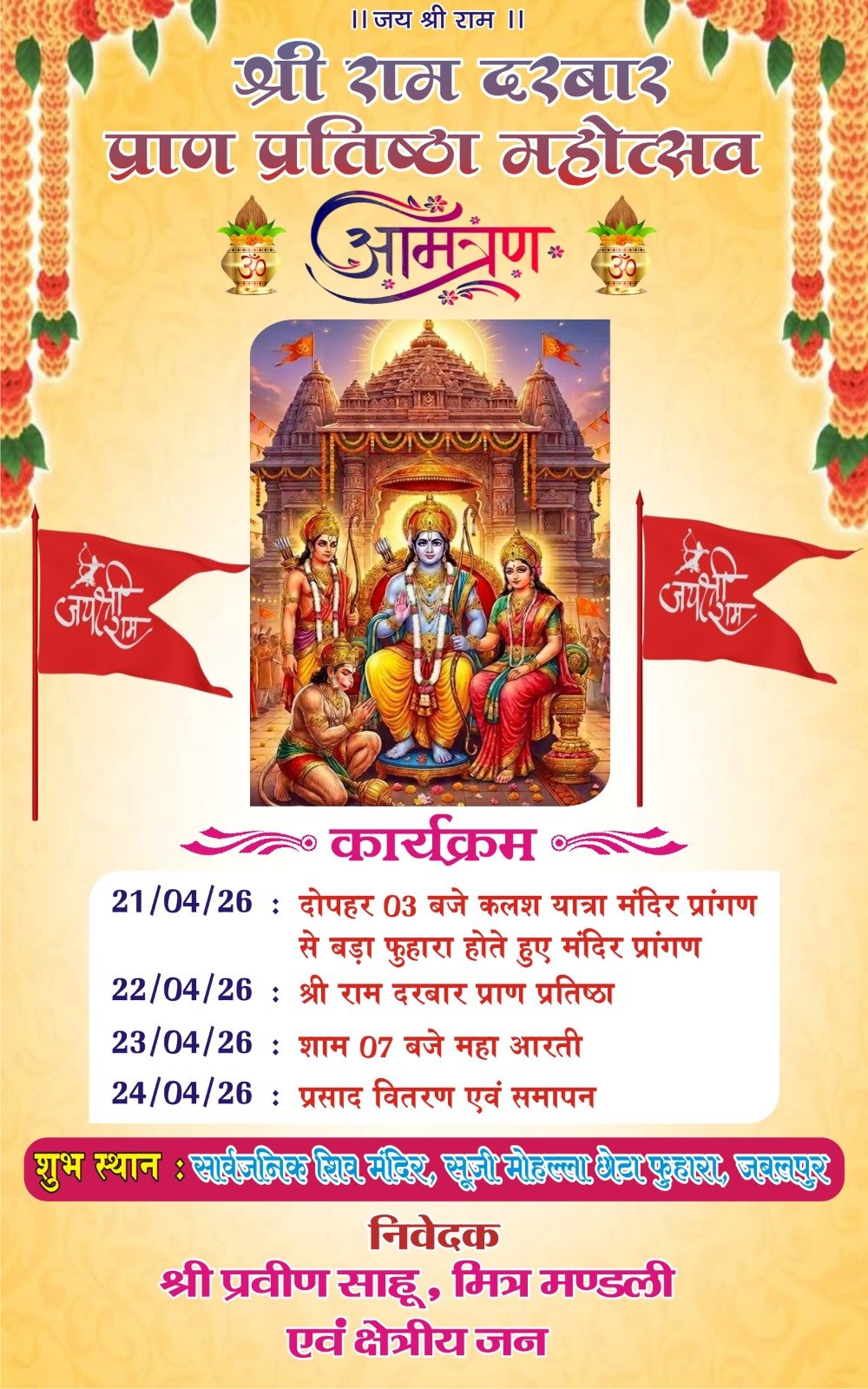 जबलपुर /ब्राह्मण एकता मंच, भगवान परशुराम वंशज द्वारा भगवान परशुराम जी की शोभायात्रा निकाली गई , ब्राह्मण एकता मंच, भगवान परशुराम वंशज के संयोजक पंडित राम दुबे, पंडित योगेंद्र ने समस्त ब्राह्मणों को शोभायात्रा में शामिल होने आमंत्रित किया था। शहर के सभी क्षेत्रों से टोलियां शामिल हुई। महिलाओं ने भगवान परशुराम जी के भजनों … Read more