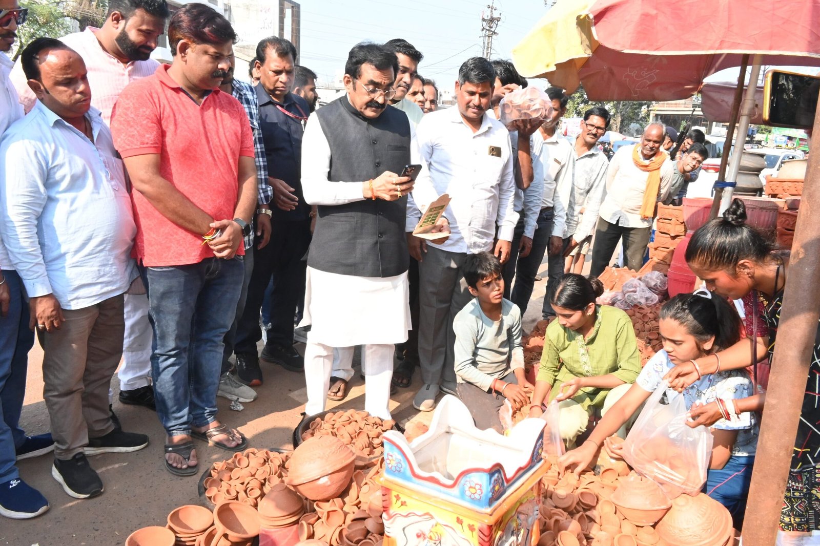 लोक निर्माण मंत्री श्री राकेश सिंह ने गढ़ा बाजार में खरीदे मिट्टी के बने दीपक.
