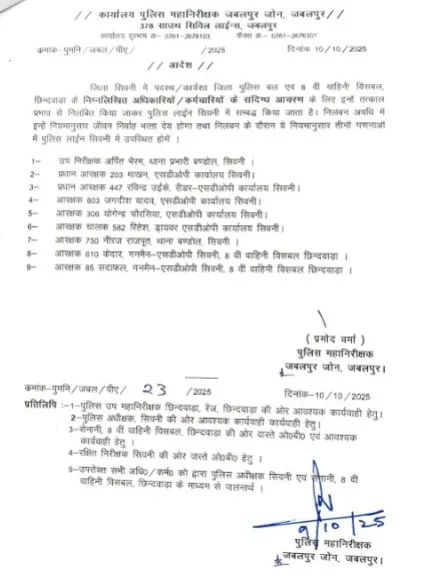 मध्यप्रदेष के जबलपुर पुलिस जोन के तहत आने वाले सिवनी जिले के बंडोल थाने सें बडी खबर निकल कर सामने आ रही है। जबलपुर जोन के आईजी प्रमोद वर्मा नें बंडोल थाना प्रभारी सहित 9 पुलिस कर्मियो को निलंबित कर दिया,निलंबित कर्मचारियो मे सबसे अधिक SDOP कार्यालय में पदस्थ है। SDOP पूजा पाण्डे की भूमिका की भी जाच की जा रही है।