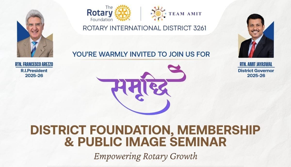 जबलपुर। आर्थिक रूप से समृद्ध और सशक्त भारत के निर्माण तथा समाज सेवा के विविध कार्यों को नई गति देने हेतु रोटरी का वार्षिक रोटरी डिस्ट्रिक्ट फाउंडेशन, मेम्बरशिप एवं पब्लिक इमेज सेमिनार आगामी 30 नवंबर को संस्करधानी जबलपुर में आयोजित किया जा रहा है। यह आयोजन होटल हिल्टन में रोटरी इंटरनेशनल डिस्ट्रिक्ट 3261 के प्रांतपाल रोटे अमित जायसवाल के नेतृत्व में संपन्न होगा।